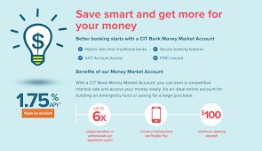 CIT Bank offers an interest rate of 2.45% on money market accounts — more than 15x the national average. Just like with a checking or savings account, your money is FDIC secured, there are no monthly service fees, and you can access your funds any time. All you need is $100 to open an account and start earning more money on the cash you already have.